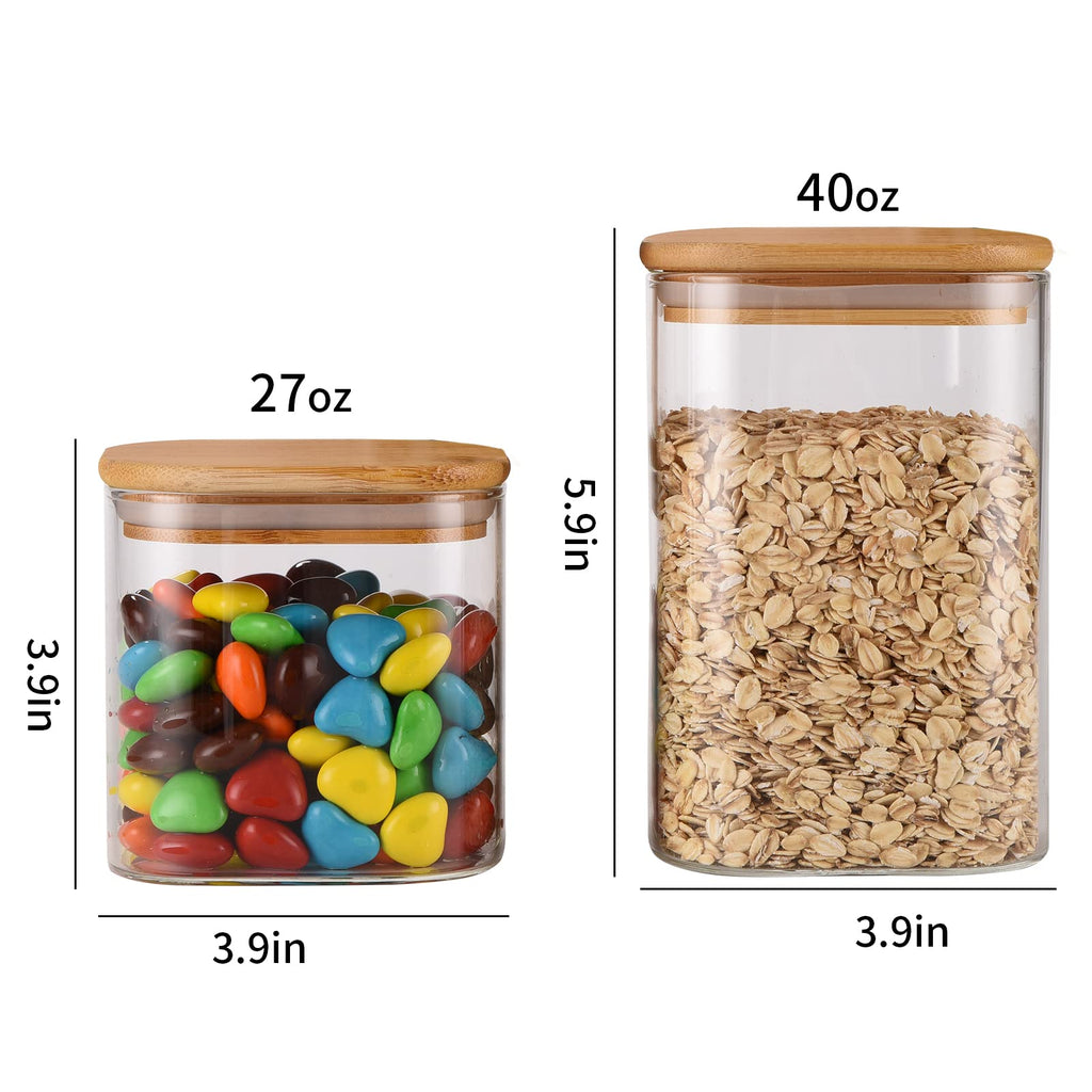 - [Product Details] Capacity: 27oz(4inch*4inch), pack of 2 and and40oz(4inch*5.9inch),pack of 2. Perfect size to store your food in your kitchen or office. Note: The glass jars is safe in dishwasher while the wood lid is hand washing only!